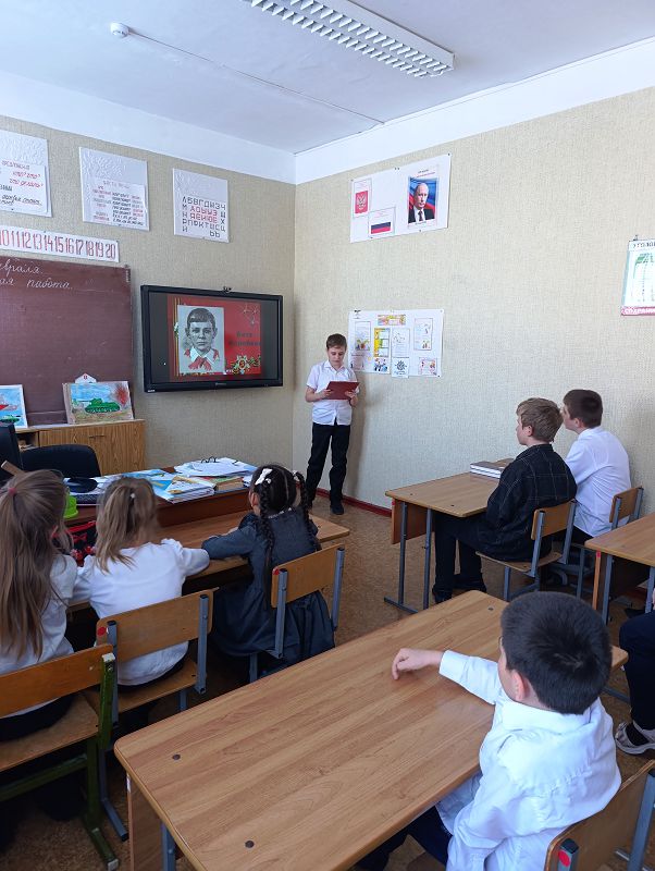 Особое внимание привлекло школьников прочитанное стихотворение С. Михалкова «Десятилетний человек», которое заставило детей задуматься о стойкости своих сверстников, переживших военное лихо. Патриотический час сопровождался презентацией «Дети-герои». В заключение мероприятий присутствующие почтили память погибших юных героев минутой молчания. Надеемся, что имена юных солдат останутся в памяти ребят надолго.