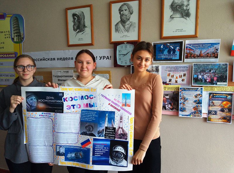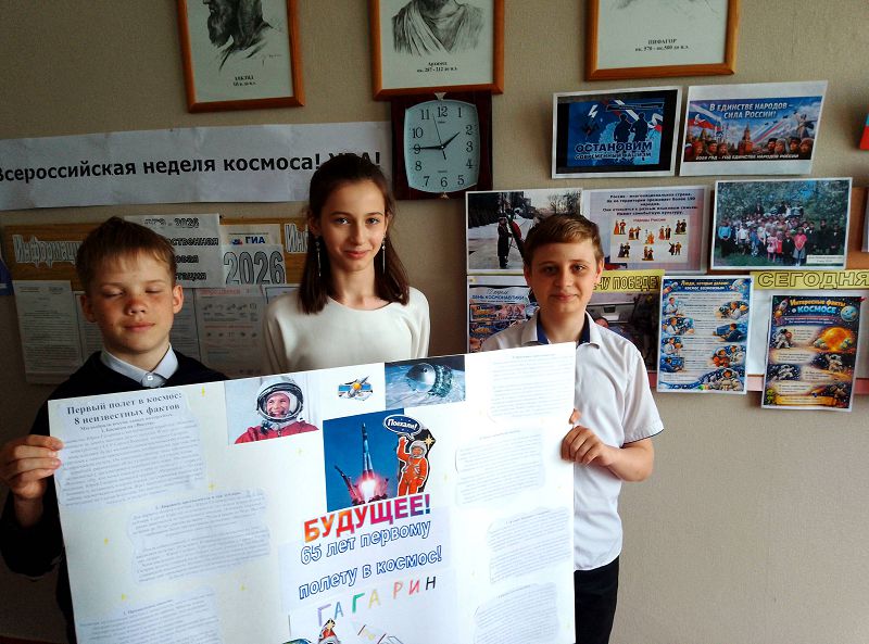 Проведена викторина «Космические ребусы», в игровой форме ребята знакомились с Солнечной системой, космическими телами и созвездиями. Учащиеся продемонстрировали свои знания и эрудицию по теме и умение разгадывать ребусы. Конкурс стенгазет «Полет человека в космос». Ребята подготовили информацию с иллюстрациями о малоизвестных фактах полетов в космос. Всё это представили в виде стенгазет. Победители получат приз. Неделя Космоса состоялась, ура!